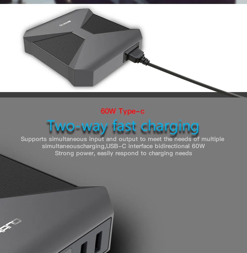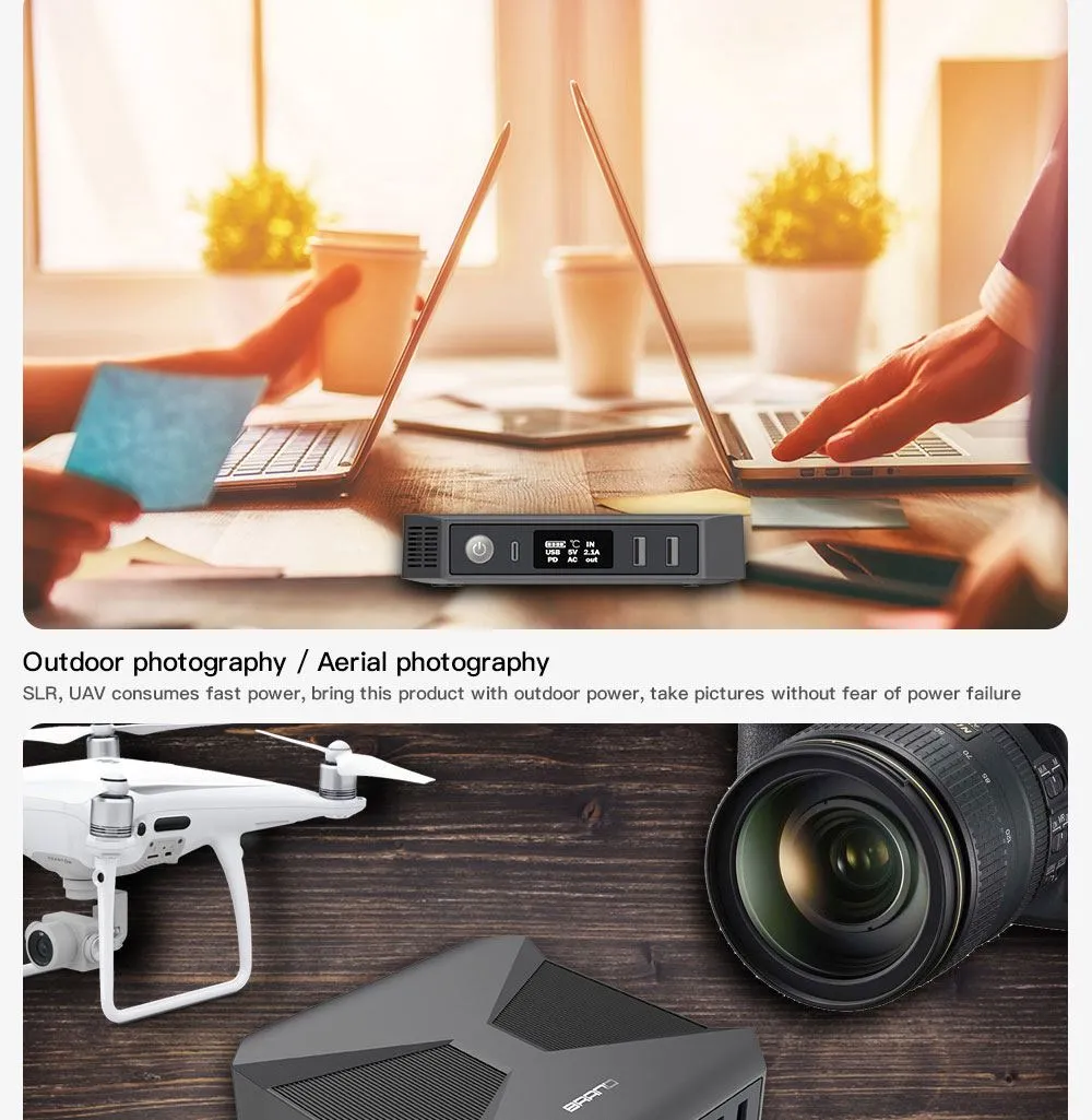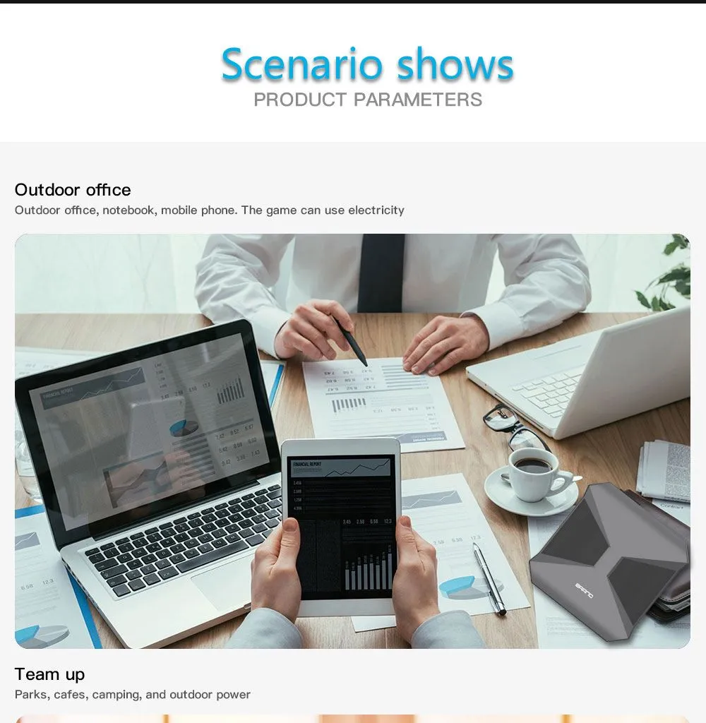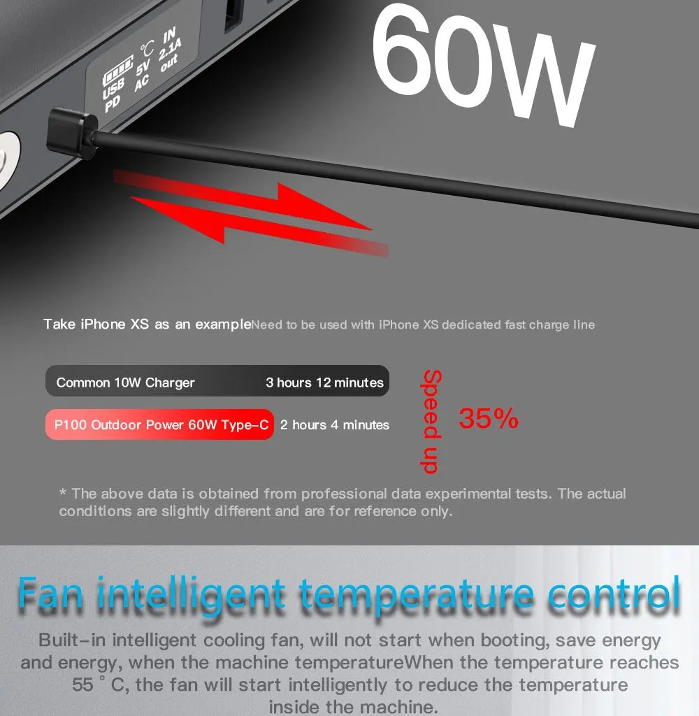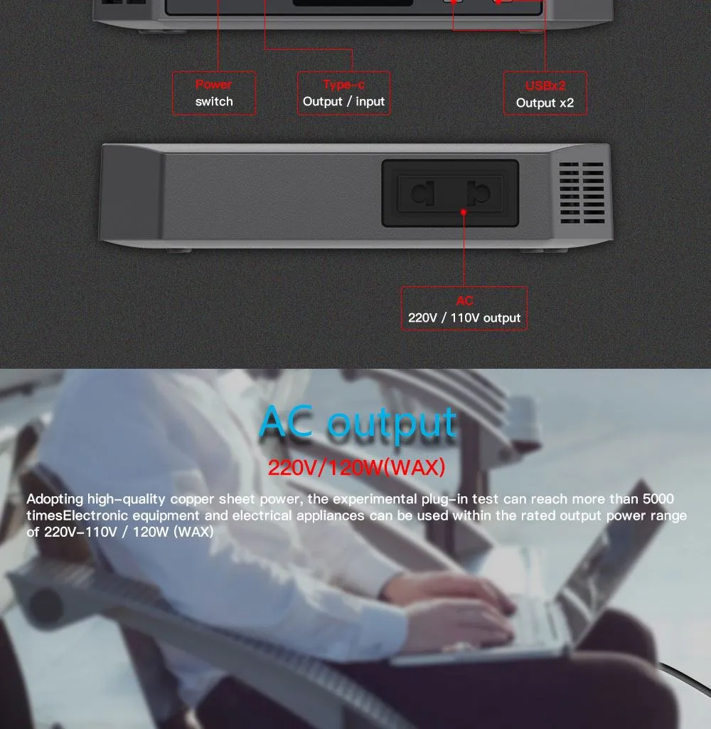 Product model:P01 The battery capacity is 106WH/28800mAh, and it is equipped with a ternary lithium battery. AC Output Power:100W Overpower:120W Peak value:200W 110V/60HZ or 220V/50HZ USB OUT:USB1: QC3.0 USB OUT:USB2: 5V/2.4A TYPE-C1 IN/OUTPUT:PD60W